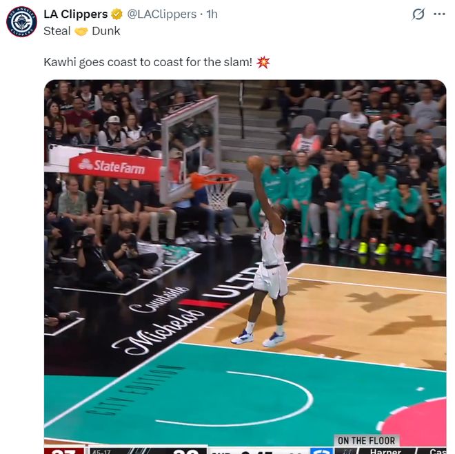 第二节带第二阵容的伦纳德开始进入了进攻模式,他单节5中3拿到7分3篮板1助攻1抢断,他的抢断一条龙暴扣也非常精彩,快船也一度领先马刺达到25分之多,上半场快船攻防都顺风顺水。